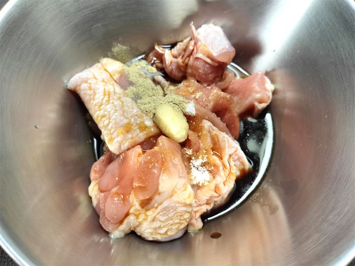 1. ボウルに鶏肉を入れ、酒、しょうゆ、砂糖、しょうが、こしょうを加えてもみ込み、30分間ほど置きます。