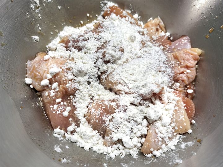 2. 鶏肉の余分な汁けを切り、小麦粉をもみ込んで粘りを出します。