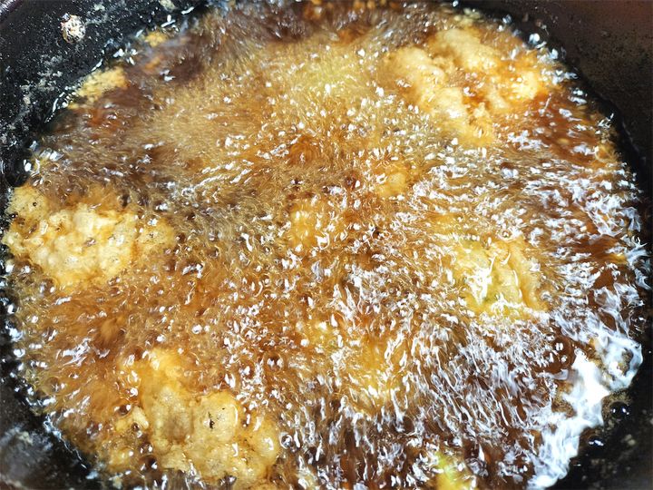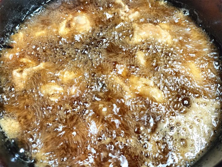 3. ひと切れずつ片栗粉をまぶして形を整え、170℃の揚げ油で3分間揚げて一度取り出し、3分間休ませます。休ませた後、180℃の揚げ油で1~2分間揚げます。