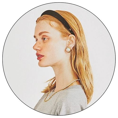 品のいいベロアとパール。クラシックなテイストでそろえたアクセサリーを丁寧に飾って、気楽なスエットをクラスアップ。細めながらふっくらとしたボリューム感があるカチューシャは、サイドアングルがより魅力的。