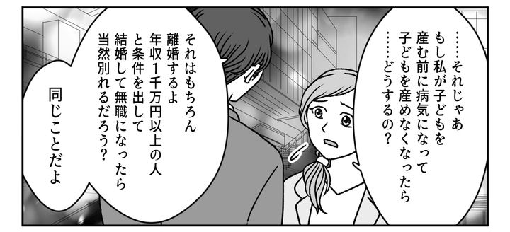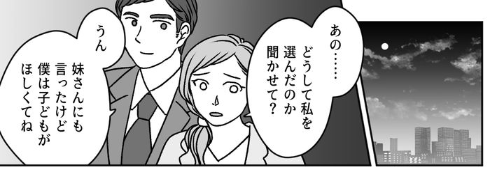 コウタロウさんと仕事終わりに待ち合わせをして会ったとき、私を選んだ理由を思いきって聞いてみました。妹が言っていたとおり、コウタロウさんからは「子どもがほしいから」という言葉が出てきました。コウタロウさんが求めているのは私ではなく、子どもが産める女性なのです。