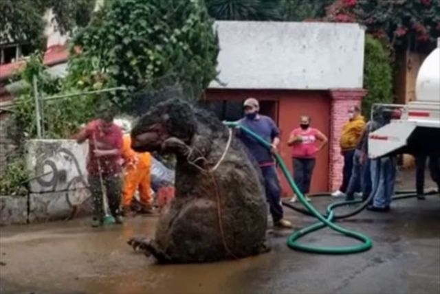 下水も詰まってしまったため、下水の清掃もしていたそうなのですが・・・、その際に出てきたのがこの巨大なネズミだったといいます。 高さは人間の大人ぐらいあって、横幅もなかなかのもの。 人々はホースで水をかけて汚れたネズミを洗っていますが、あまりの大きさといい姿勢といい、ちょっと不自然なものがあります。