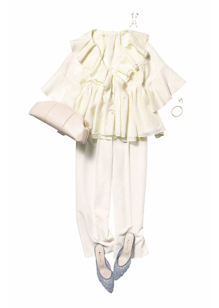 ブラウス¥28, 600シューズ¥38,500(とも にツル バイ マリコ オイカ ワ)パンツ¥9,990(アンフィーロ/アンフィーロ〈オンワ ード樫山〉)バッグ¥46,200 (オルセット/オルサ)イヤリング¥2,860〈ハクフルール〉バングル¥4,180〈ヘンカ〉 サークルリング¥24,20〈0 CAKI〉 リング¥33,000〈four seven nine〉(すべてロードス)