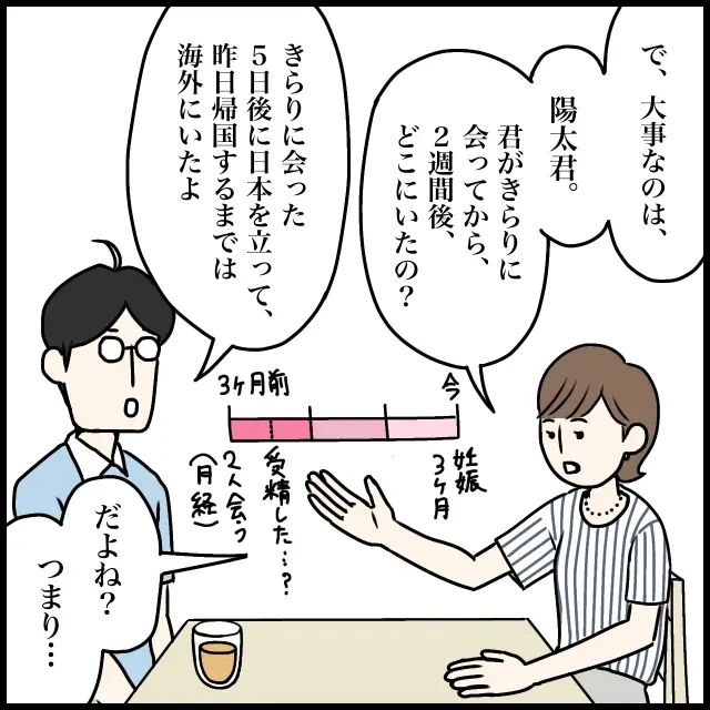 すると、「で、大事なのは、陽太くん、君がきらりに会ってから、2週間後どこにいたの?」ひかりさんにそう言われ、「きらりに会った5日後に日本を立って、昨日帰国するまでは海外にいたよ」陽太さんが答えると、「だよね?つまり・・」