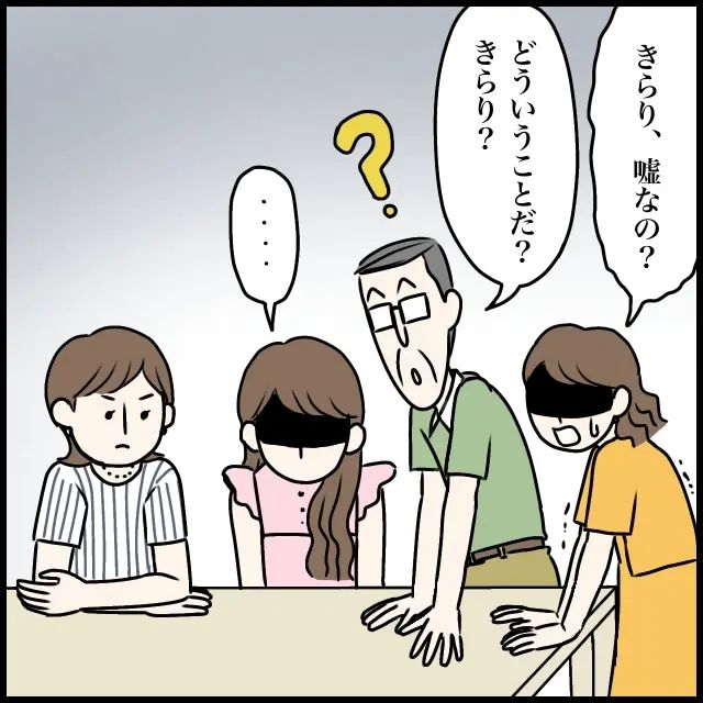 ひかりさんの言葉を受けて、「きらり、嘘なの?」と青ざめるお母さんと、「どういうことだ?きらり?」と全くわけがわからないお父さんを前に、きらりちゃんは無言になってしまいました。