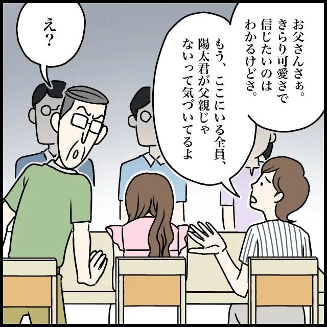 「お父さんさぁ。きらり可愛さで信じたいのはわかるけどさ。もう、ここにいる全員、陽太くんが父親じゃないって気づいてるよ」ひかりさんがそう言うと、「え?」と驚くお父さん。