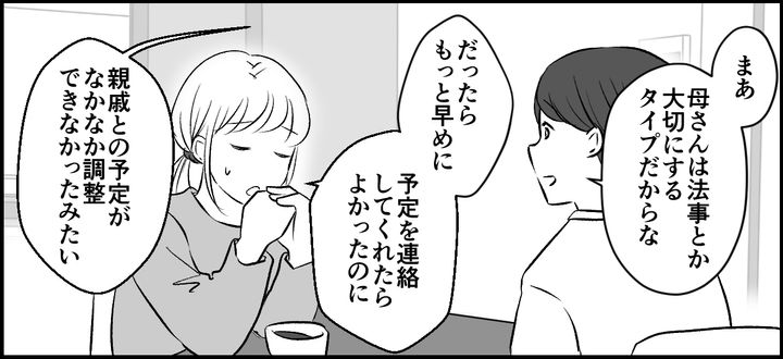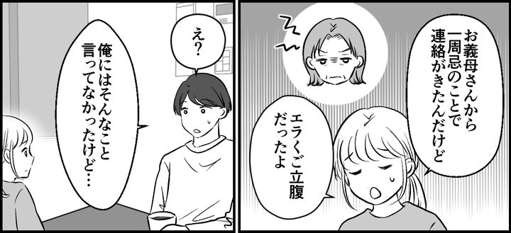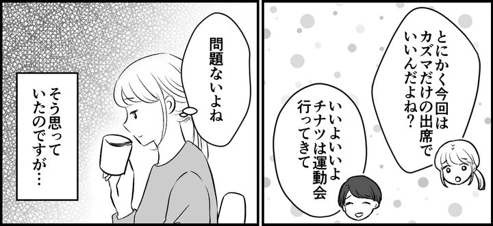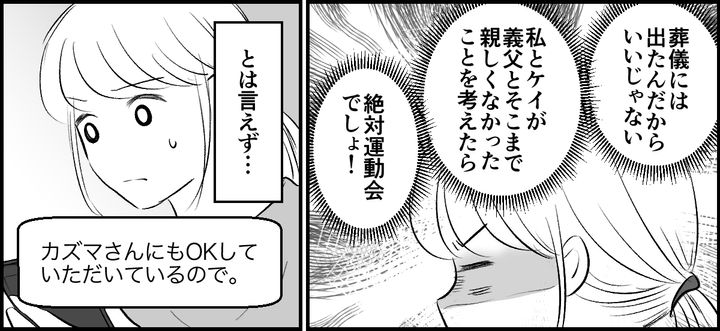 私(チナツ、40代)は夫(カズマ、40代)と小6の息子(ケイ)との3人暮らし。今年は小学校生活最後の運動会。息子は応援団長という大役を任され、練習に励む毎日です。しかし今月の運動会を目前に、義父の一周忌と運動会が重なっていることがわかりました。私たち夫婦は話し合い、夫は一周忌へ、私と息子は運動会へ行くことにしたのですが、義母(ミズエ、70代)は一周忌を優先すべきだと言います。