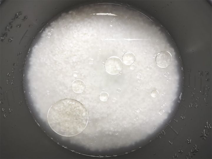 1. 浸水させた米を炊飯器に入れ、通常の分量の水(分量外)と太白胡麻油を加えて炊きます。