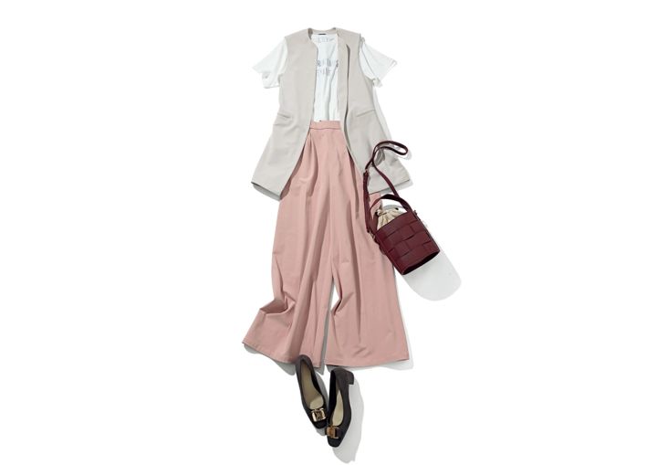 ジレ¥19,000/PLST ロゴTシャツ¥3,498/ロペピクニック(ジュン) ピンクワイドパンツ¥23,100/アルページュストーリー スクエアパンプス¥9,900/RANDA バケツバッグ¥6,996/デッサン(ワールド)
