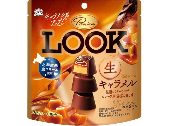 ・昨年期間限定で発売した「プレミアムルック(生キャラメル)パウチ」が、キャラメル感アップで再登場 ・とろけ出す生キャラメルソースと、くちどけの良い生キャラメルガナッシュをミルクチョコで包んだ、3層構造のプレミアムな大粒ルックチョコレート ・チョコレート専門店で売られている贅沢なボンボンショコラをイメージした、プレミアムルック専用のモールド(型)を採用 ・素材にこだわり、北海道産生クリーム、発酵バター、フランスロレーヌ産岩塩を使用