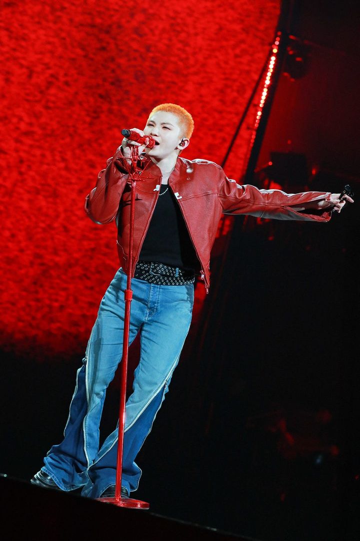 WOOZIのソロステージでは、まず「Ruby」「Simple」を披露。ギターを手に登場すると、その旋律が会場全体に響き渡り、客席は赤く染まりました。スタンドマイクの前で熱唱する姿は心に直接訴えかける力強さがあり、圧倒的な歌唱力で観客を魅了しました。