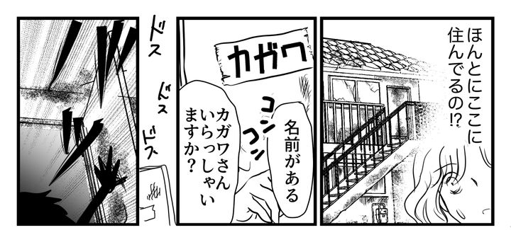 廃墟に近いアパートの前で立ち尽くす私。教えてもらった部屋番号のドアには、マジックで「カガワ」と書いたガムテープが貼ってあります。思い切ってノックすると、女性が出てきました。