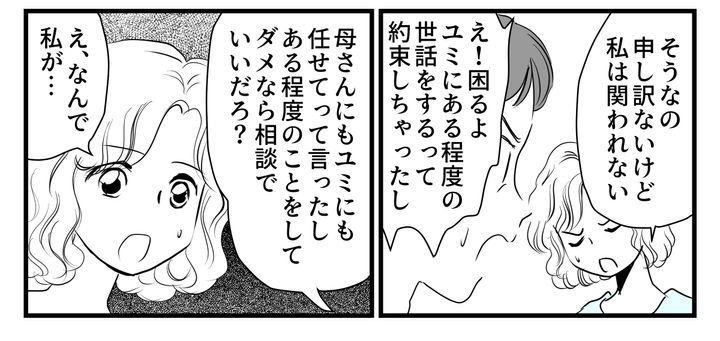 あまりの様子に私はカガワさんの面倒を見られないとヒロナリに伝えますが、ヒロナリは義母や義妹に「ある程度は世話をする」と勝手に約束していたことがわかったのです。