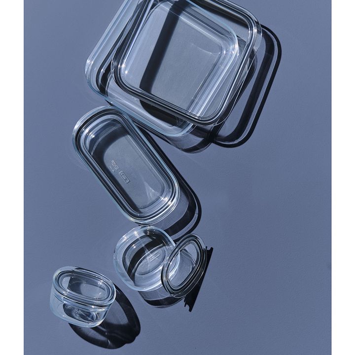 「特殊なプラスチック素材でガラスのようにクリアで美しいうえに軽くて丈夫!サイズ展開も豊富でたくさん集めたくなります」調理ができる保存容器クリアS各¥1,210、M¥1,870、L¥2,970(すべてライクイット)