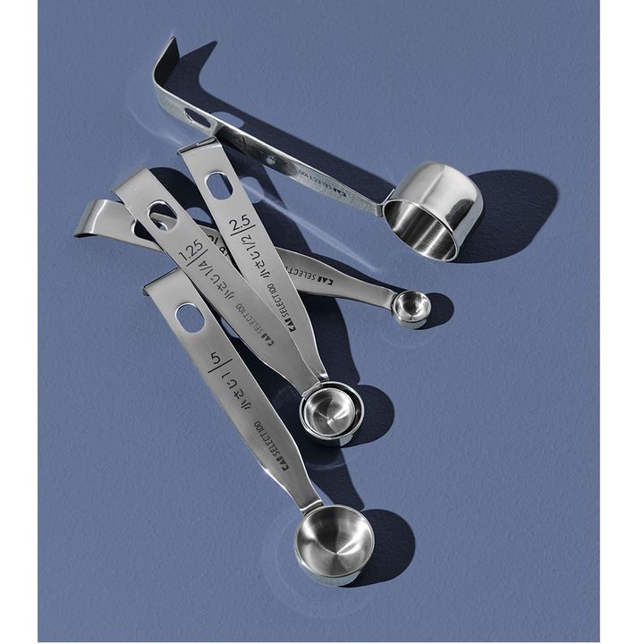 「底がフラットで置ける仕様になっているので、特に粉類が計量しやすいんです。置いたままでの計量もできたり、5本まとめてスタッキング収納が可能なのもポイント」SELECT100 計量スプーン5本組¥2,420(貝印)