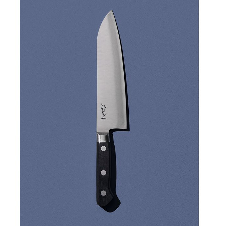 「刃先以外をステンレスで挟んだ3層構造のハガネの包丁は、切れ味が長持ち。包丁って合うものに巡り合うのが意外と難しいですが、これは本格派な料理好きがハマる1本だと思います」三層三徳包丁19cm¥30,800(食道具竹上)