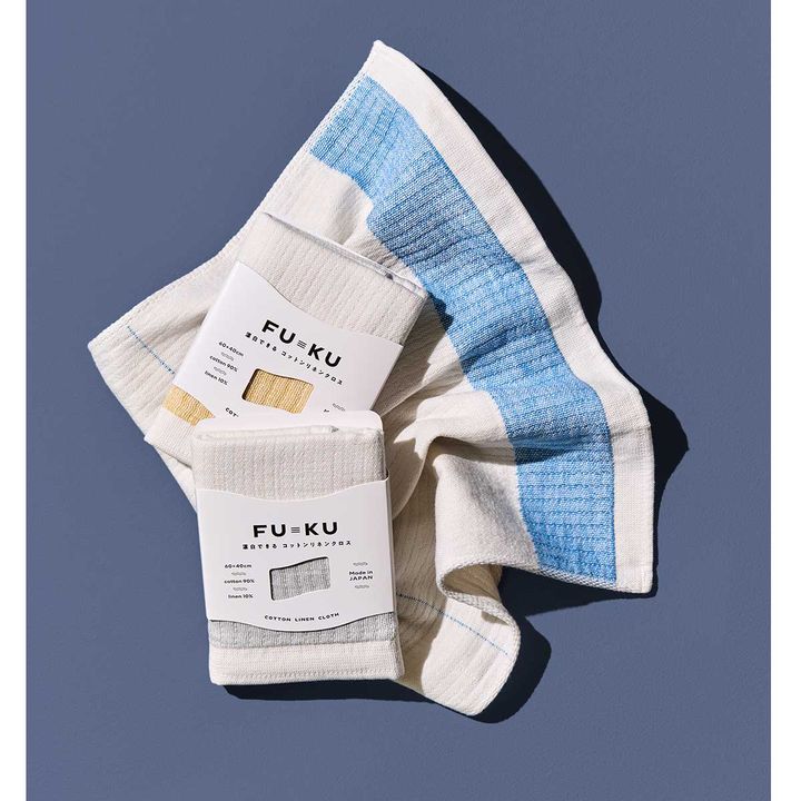 「出番が圧倒的に多いから、リネン混合で乾きやすく、繰り返し洗ったり漂白してもへたれない丈夫さが嬉しい!手や食器もさっと拭けて、鍋つかみにもなる万能クロス」FU-KUコットンリネンクロス各¥1,980(すべて伊織)