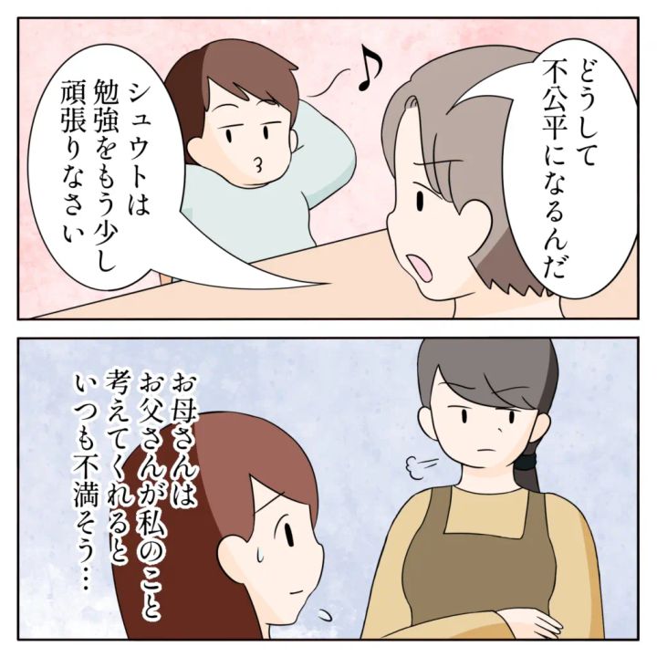 「どうして不公平になるんだ。シュウトは 勉強をもう少し頑張りなさい。」父に言われてシュウトもそれ以上は言えなくなりました。チラリと母の様子をうかがうと、不満そうに怒ったような顔。母は、父が私のことを考えてくるといつもこんな顔をするのです。