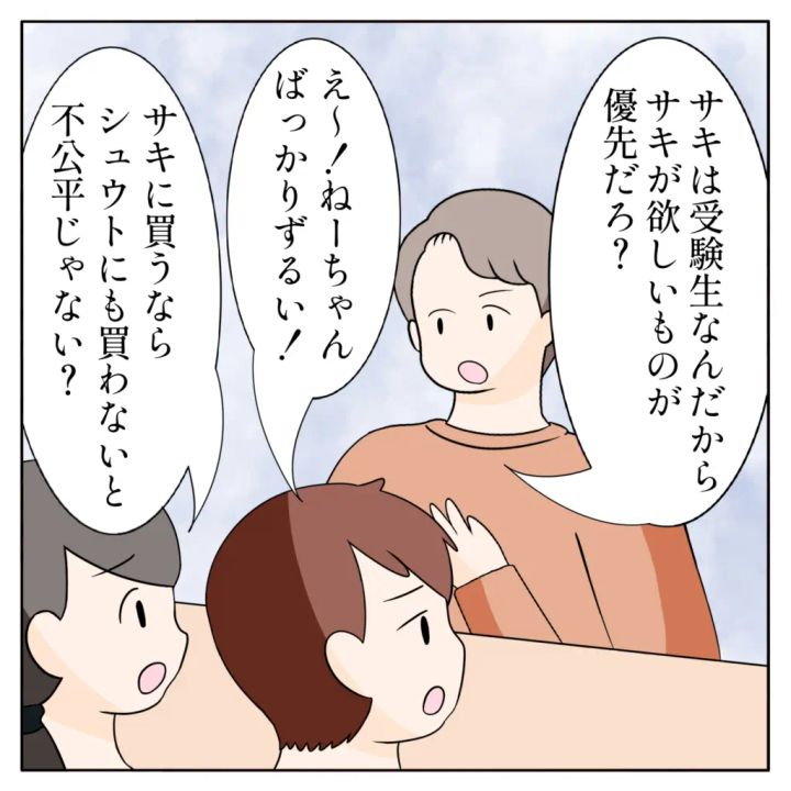 母とのやりとりを聞いていた父が、「受験生なんだからサキの欲しいものが優先だろ?」と助け船を出してくれても「え~!ねーちゃんばっかりずるい!」とシュウトが言うと、すぐに母も「サキ買うならシュウトにも買わないと不公平じゃない?」とフォローします。