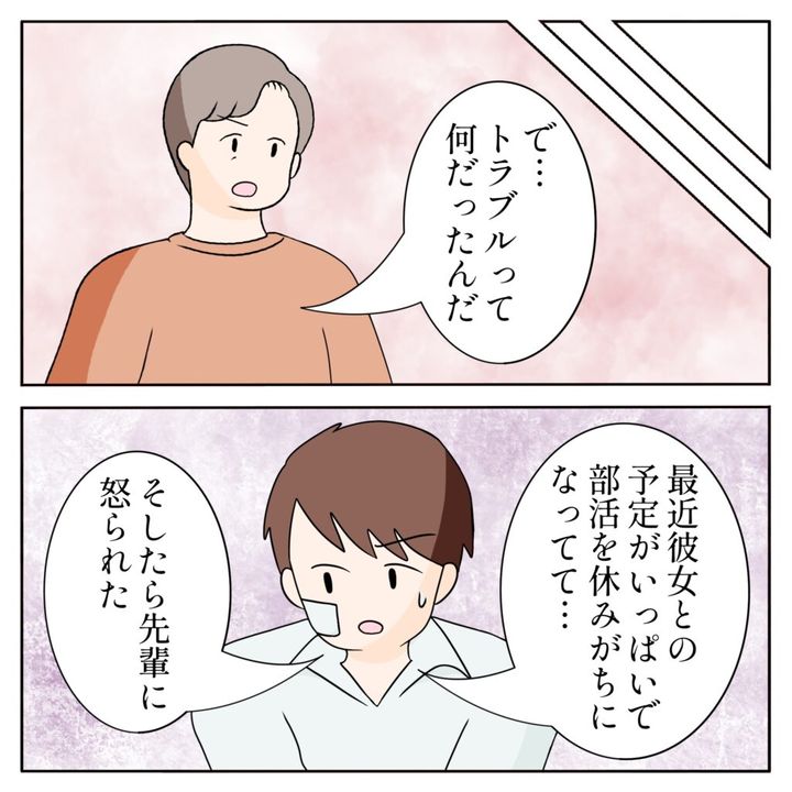 その日の夕方、父にトラブルの原因を聞かれたシュウトは正直に話しました。「最近、彼女との予定がいっぱいで部活を休みがちになってて・・・そしたら先輩に怒られた。」