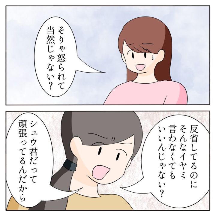 それを聞いて思わず「そりゃ怒られて当然じゃない?」と私が言うと、母は「反省してるのにそんなイヤミ言わなくてもいいんじゃない?シュウ君だって頑張ってるんだから。」とムキになって私に言いました。