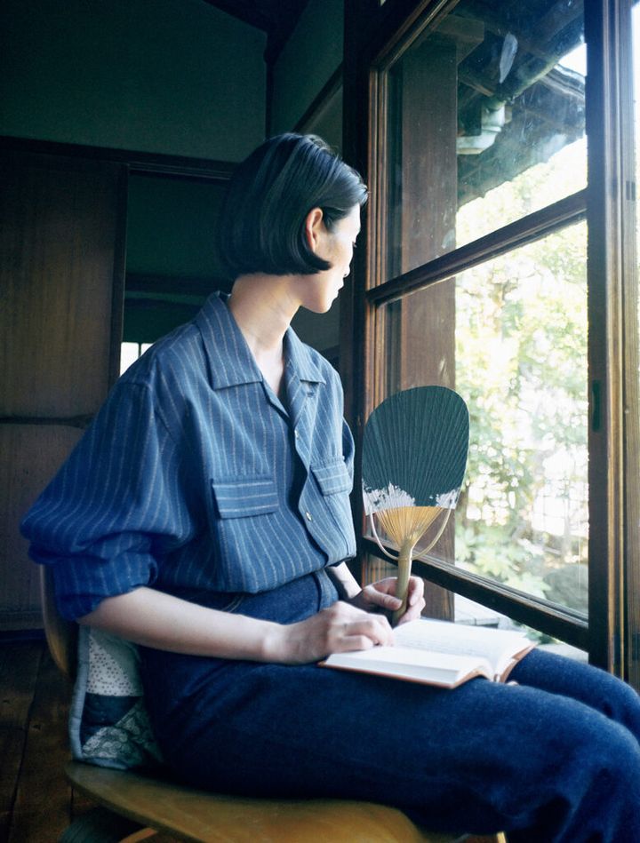 まだ暑さの残る日暮れ前。縁側でうちわを片手に、物語の続きを読み進める。「ひすい」と名付けられた深みのあるブルーが涼やかなうちわは、アップサイクル商品を中心に日用雑貨を扱う、東京・豪徳寺の『ニエンテ』で見つけたもの。地紙には、漆の中の不純物を濾すために使われた紙を再利用。軽くパリッとした質感で、色の乗り方やシワの出方がひとつひとつ違う一点もの。[W17.5×H38㎝]¥1,980(ニエンテ 03−6379−1705) シャツ¥110,000(ビズビム 03−5468−5424) デニムパンツ¥25,300(ヤエカ/ヤエカ アパートメント ストア 03−5708−5586)。その他スタイリスト私物