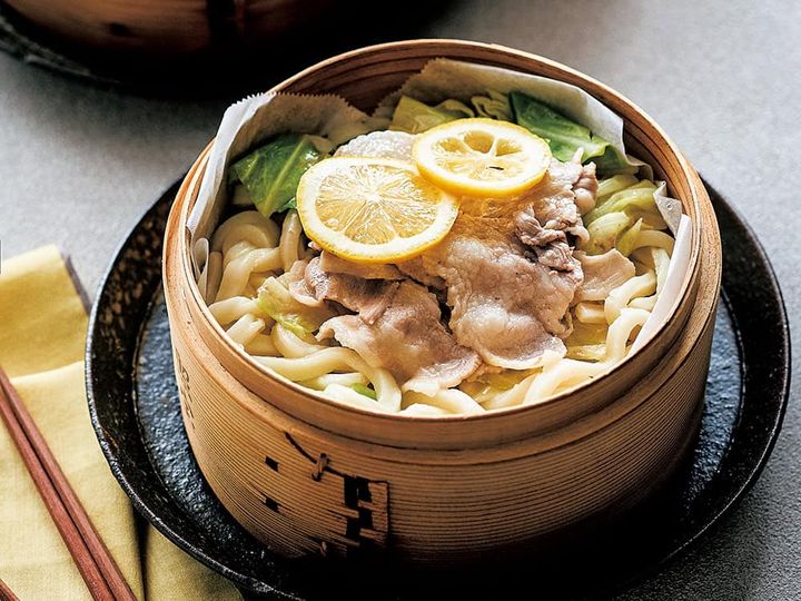 クッキングシートに、冷凍うどん、キャベツ、豚肉、レモンの順に重ねタレ(鶏ガラスープの素小1、塩、酒、ごま油)をかけ強火で15分蒸す。