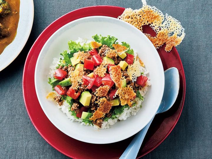 ひき肉と玉ねぎを焼肉のタレとケチャップで炒める。ピザ用チーズをレンチンし、冷めたらご飯と野菜にONして完成!