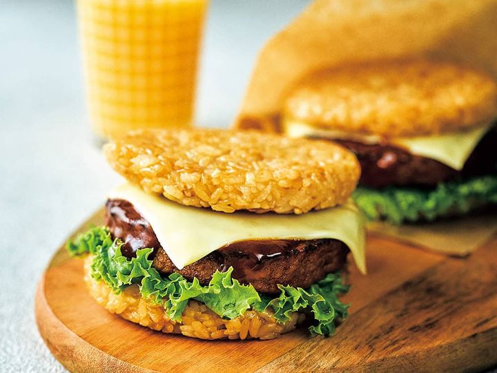 ご飯に片栗粉と醤油を混ぜたらラップで包み、ギュッと丸くする。両面を焼いたら、温めたハンバーグ、レタス、チーズを挟む。