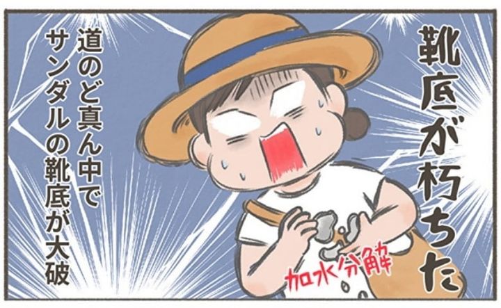 30代半ばで離婚して実家に出戻りした、40代独身マンガ家の大日野カルコさん。「くそ地味な日常」をマンガにされています。奮発して購入したメーカーのサンダルを、5年以上愛用していたカルコさん。ある日、道の真ん中で靴底がポロッと取れてしまい痛い目に遭ったのですが、またしても……。