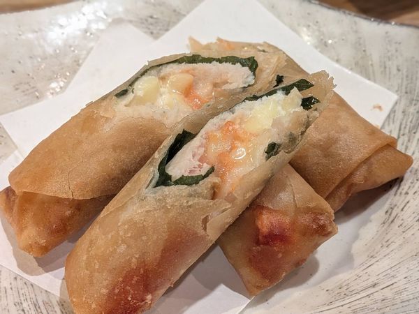 サッパリ鶏とチーズめんたいが巻かれた春巻きはパリパリで、中からトロっとチーズが出てきます。本当においしい!