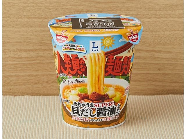大阪の名店人類みな麺類監修のカップ麺です。貝の旨味が利いたスープが特長です。