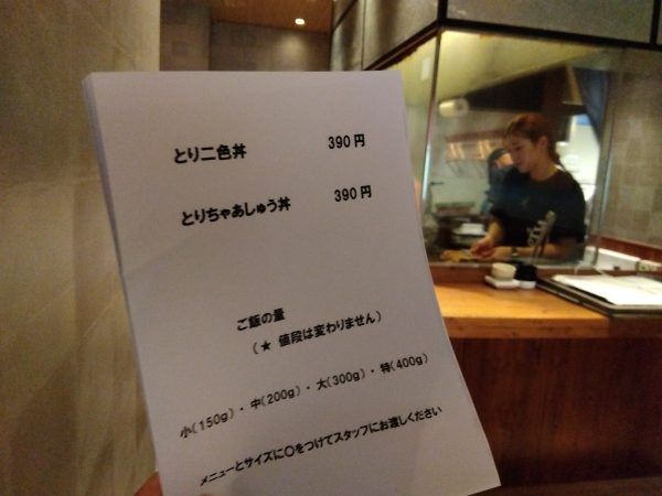 390円ランチは、とり二色丼ととりちゃあしゅう丼の2種類。やさしい味わいの鶏スープと漬物付なんですよ。しかも、お値段そのままでご飯の量が選べますよ。150gの小盛りから、200gの中盛り、300gの大盛り、さらには400gの特盛まで、自由に選べます。ウレシイ~。女性は小盛りか中盛りが多いようですが、男性はガッツリ特盛も!さらに、とり二色丼ととりちゃあしゅう丼の両方を食べる方も!! オイシイからですよね~。
