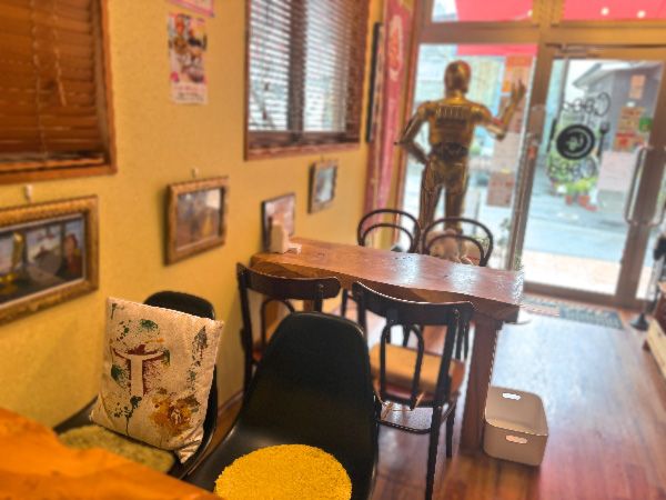 道後温泉のにぎわいから少し離れたこの一角に、落ち着いて過ごせるカフェがあるんです。店内には、店主さんが約25年かけて集めてきた映画関連のコレクションがずらり。ヘルメットや等身大のフィギュアなど、そのスケールと量に圧倒されます。