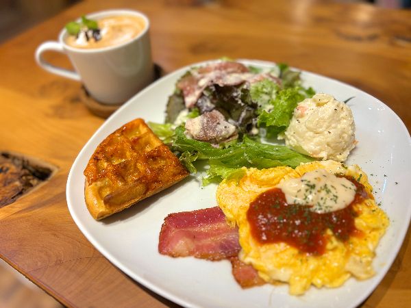 セット内容は、好きなドリンクに+350円で、スクランブルエッグまたは目玉焼き、サラダ、焼きたてのワッフルがついてきます。さらに、+150円でもう1枚ワッフルを追加することも可能です。