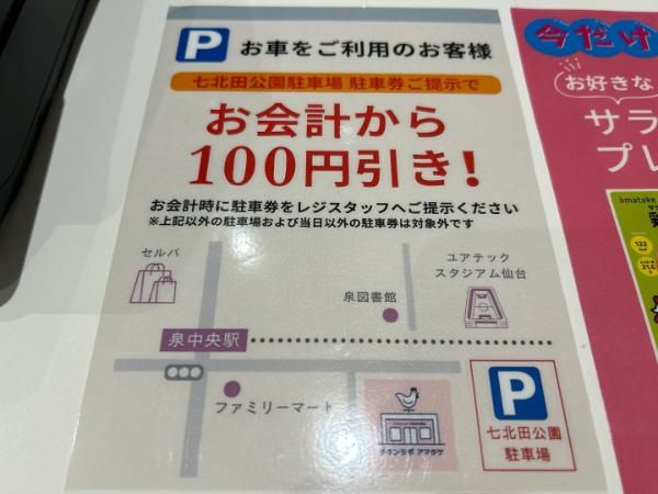 七北田公園の駐車場に停めて駐車券を提示すると、お会計から100円引きになるそうです。
