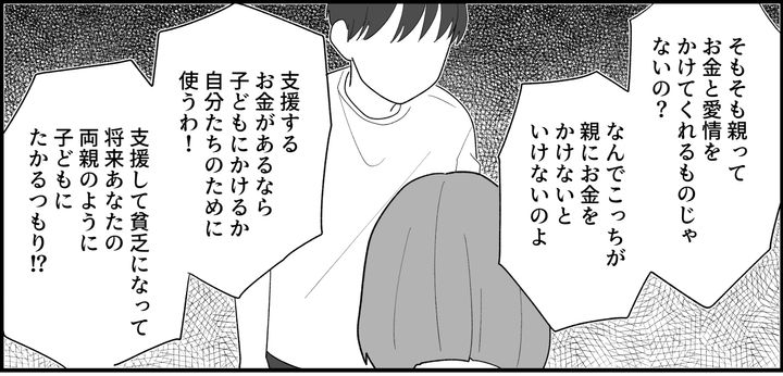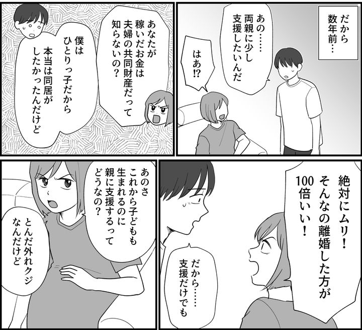 僕はコウタ(36)。妻のカナ(32)とユウスケ(5)と3人で暮らしています。僕の両親は昔からとても優しい人です。数年前から年金で暮らしており、僕は両親と同居、ダメなら支援だけでもしたいと思っていたのですが……カナに反対されました。カナの「家族のためにお金を使いたい」気持ちもわかりますが、僕にも育ててくれた両親に恩返しがしたい気持ちがあります。ただ、カナは自分こそが正しくて、反対意見を言うとヒステリーを起こすので、説得するのが難しいのです。
