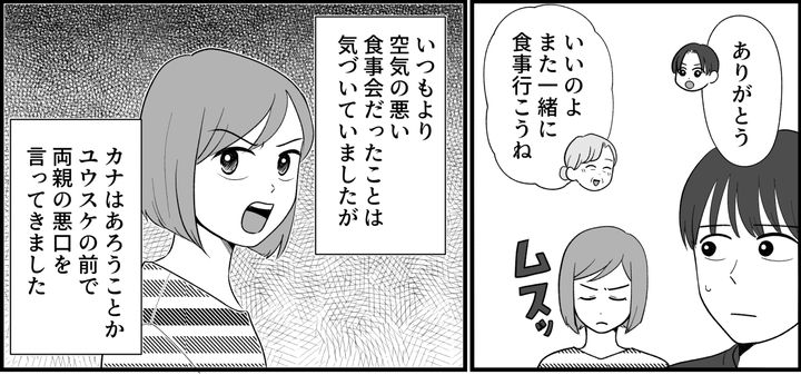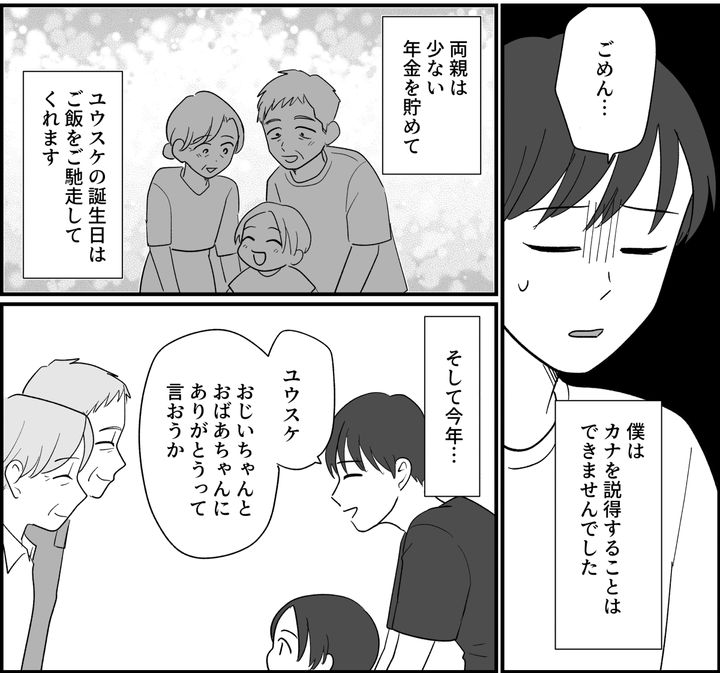 両親になにもできないことが心苦しくあるのですが、両親は僕を責めてきたことはありません。それどころか、少ない年金を貯めて、こうやってユウスケの誕生日はご飯をご馳走してくれたりするのです。それなのにカナは……ご馳走になったうちの両親に対して、ユウスケに「ありがとう」や「ご馳走様」を言わせることすら面白くないようでした。