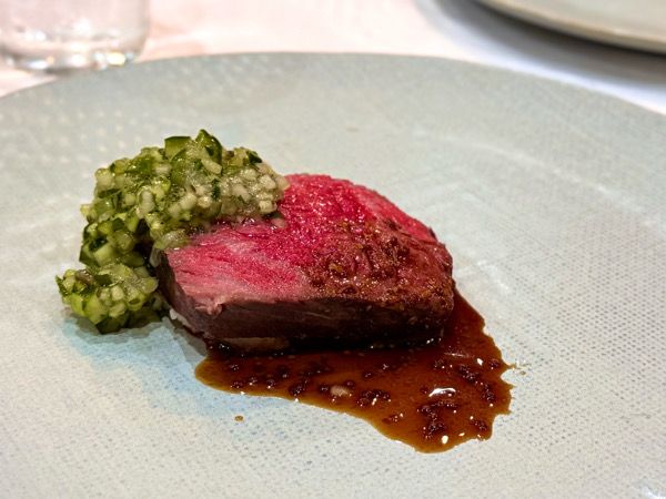 肉料理はイチボのステーキ。シンプルな醤油ベースのソースがお肉の美味しさを引き立てます。添えられたキュウリと昆布のソースは爽やかにアクセントを加えてくれます。