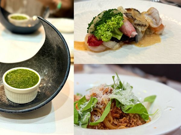最初に運ばれてきたのは、つるむらさきのフラン。つるむらさきの香りとふんわりした食感が、これからの料理を楽しみにさせてくれます。続く前菜は、ホタテ・あわび・たこ・エビ・くじら・ホタルイカといった魚介が贅沢に盛り込まれ、ブロッコリーやトマトのマリネが彩りを添える一皿。まるで宝石箱を覗くような華やかさです。