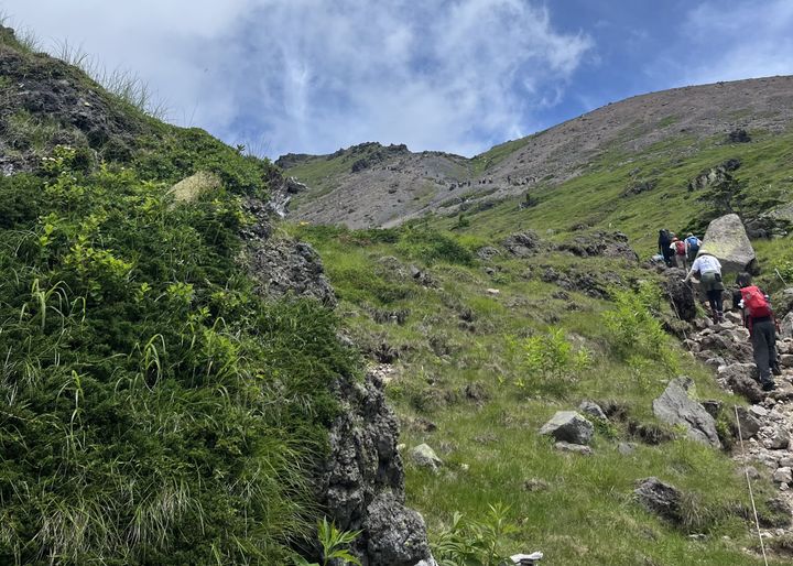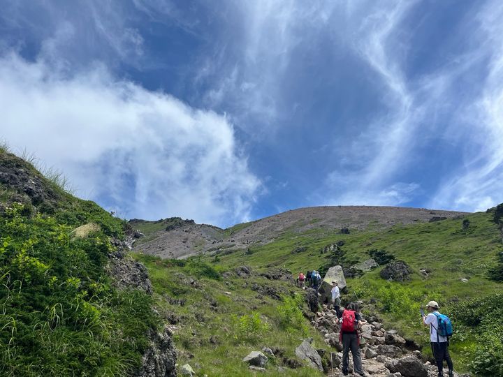 樹林帯を抜けると、写真のように青空が出迎えてくれます。一方で森林限界に出てしまうと、日陰がなくジリジリ暑い・・・いくら涼しい高山とはいえ、歩くと汗が噴き出てきます。