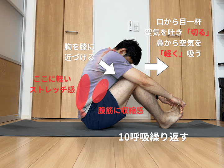 腰を丸めることで疲労した腰・背中をほぐし、しっかりと息を吐くことで腹筋のスイッチをオンにするため、腹筋強化&姿勢改善が叶います。