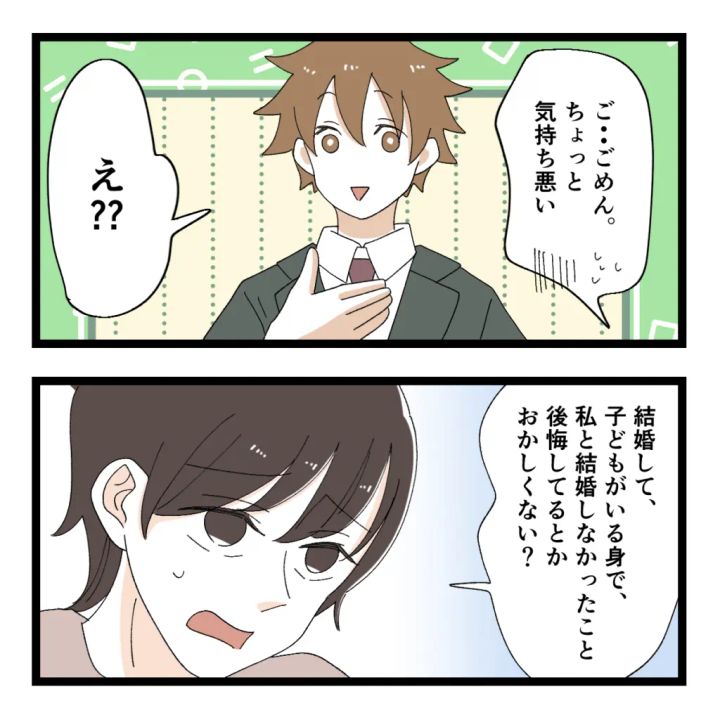 正直に「ご・・ごめん。ちょっと気持ち悪い」と伝えても「え??」とキョトンとしているヒロトさんに、マイさんはさらに「結婚して、子どもがいる身で、私と結婚しなかったこと後悔してるとかおかしくない?」と思っていることを伝えました。