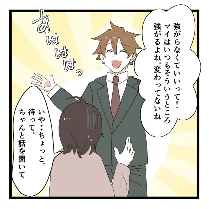 しかし、ヒロトさんは「強がらなくていいって!マイはいつもそういうところ強がるよね。変わってないね」と言って笑い飛ばし、マイさんの話しを聞いてくれません。マイさんは「いや・・ちょっと。待って。ちゃんと話を聞いて」と何度も言いますが、ヒロトさんの思い込みが強すぎて話になりません。