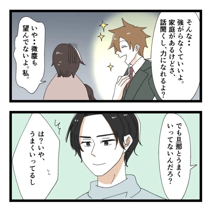しかし、マイさんが思い悩んでいると思い込んでいるヒロトさんは「そんな・・強がらなくていいよ。家庭があるけどさ、話聞くし、力になれるよ?」とにっこり。マイさんが「いや・・微塵も望んでないよ。私」と迷惑そうに答えてもヒロトさんは「でも旦那とうまくいってないんだろ?」と言い、「は?いや、うまくいってるし」と全く話が噛み合いません。