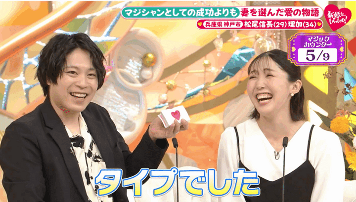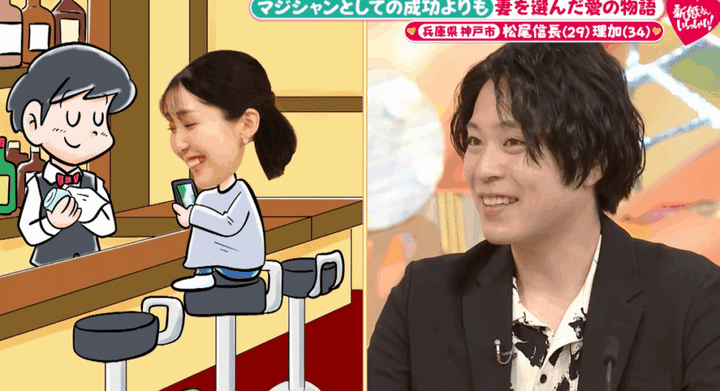 現在は企業の営業職として勤務する傍ら、依頼に応じてマジシャンとしても活躍している夫。そして妻は、幼稚園の先生。そんな二人の新婚トークが始まった。 出会いは神戸のマジックバー。友人と通っていたその場所にひとりで訪れた日、店長はひとりで来ていた夫を引き合わせてくれた。ところが、お互いの第一印象は悪かったのだという。髪が長く、毛先が金髪の夫はまさに「チャラそう」。対する妻はというと、カウンターチェアに、上着を足に被せて三角座りし “コアラがお尻をかくショート動画“ を繰り返し観ている「変」な人。