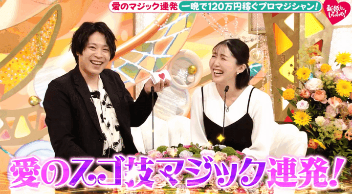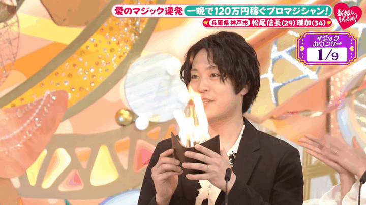 さて、ご挨拶のマジックは……取り出した財布から、火が噴き出す! ところが、このマジックにMC藤井が一言「導入が下手…」と言う始末……。しかしこの夫、8歳からマジックを始め、中学生でプロになり、ジュニアコンクールでは世界第3位となったというスゴ技のマジシャンなのだ。