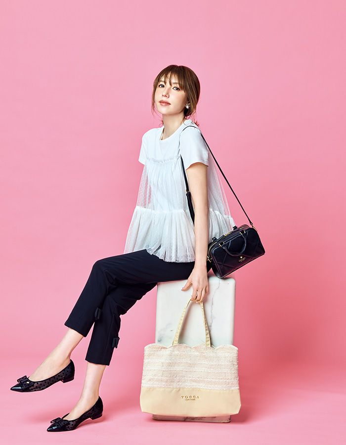 カットソー¥31,900、パンツ¥36,300、イヤリング¥9,350、ショル ダーバッグ¥27,500、ツイードバッグ¥12,100、靴¥17,600/以上TOCCA(オンワード樫山)