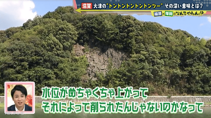 さらに塚田と福井アナは、岩肌が見える大日山を登って龍神崎観音堂へ。その観音堂は、過去に大津を襲った予期せぬ出来事や、その犠牲者の魂を鎮めるものだと勝手に解釈し……? そこで塚田は、その出来事を「洪水」、そして山は洪水で削られたと推測。「洪水から町を守るために水を堰き止めた跡があの“トントントントントン”。そして洪水の時の水位を現したのが“ツー”」という最終予想を福井アナと一緒に立てた。