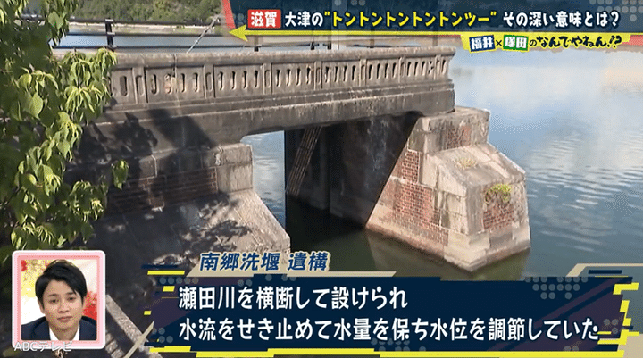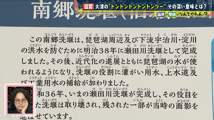 気合で瀬田川ぐるりさんぽ道を歩いた塚田と福井アナは、瀬田川洗堰の手前にある南郷洗堰(旧瀬田川洗堰)遺構で案内板を発見。南郷洗堰が、琵琶湖周辺の洪水を防ぐために明治38年に設置され、瀬田川洗堰が完成した昭和36年に取り壊されたことを知った。